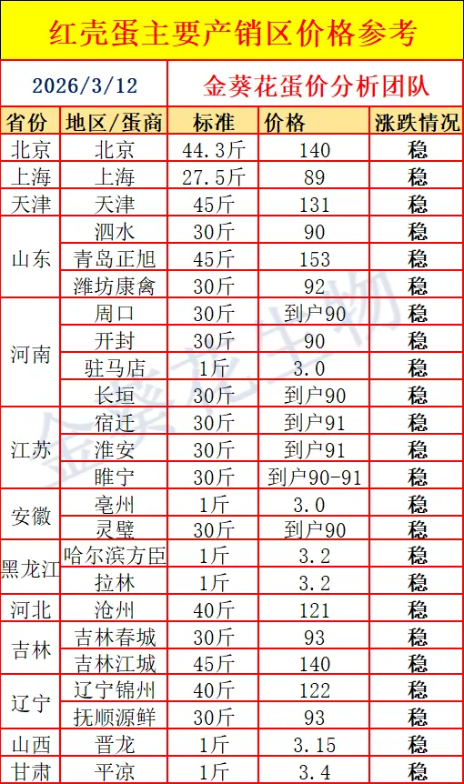 【蛋价预报】3月12日最新鸡蛋价格(整体稳定)