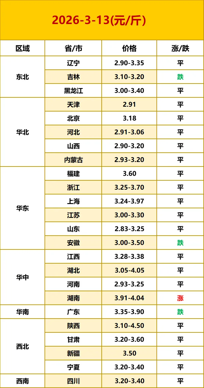 【鸡蛋价格】2026.3.13—最新鸡蛋价格 养羊网 2026-03-12 【鸡蛋价格】2026.3.13—最新鸡蛋价格点击蓝字关注我们吧~ 已关注 关注 重播 分享 赞 视频详情 鸡蛋价格早知道报价有高低,仅供参考,不作为你的买卖依据!!! 已关注 关注 重播 分享 赞 视频详情 养羊网 2026-03-12 上一篇:狼哥明日(3.13)鸡蛋价格预测,文末有豆粕下午报价 下一篇:3月12日稳-邯郸曲周鸡蛋价格-2026 您可能还会对下面的文章感兴趣111: 相关文章 近期价格更新!!! 近期价格更新!!! 2025年4月13日全国各地生猪价格信息 ##呼伦贝尔旅游包车##呼伦贝尔旅游攻略##