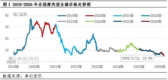 2026年生猪供应量持续增加,因此生猪价格呈现主线下滑态势。而3月份供应增加,但需求处于淡季低位水平,供大于求态势与1-2月上半月相比更为明显,猪价跌至低位水平。根据卓创资讯监测,2026年3月12日全国瘦肉型生猪交易均价10.08元/公斤,为2019年以来的最低点;此前2018年5月份出现的9.92元/公斤为近15年内的最低价,当前猪价与该价格仅相差0.16元/公斤。