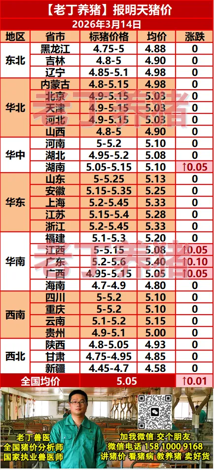 猪价有涨!【明天猪价】3月14日全国猪价涨跌表!关注老丁养猪