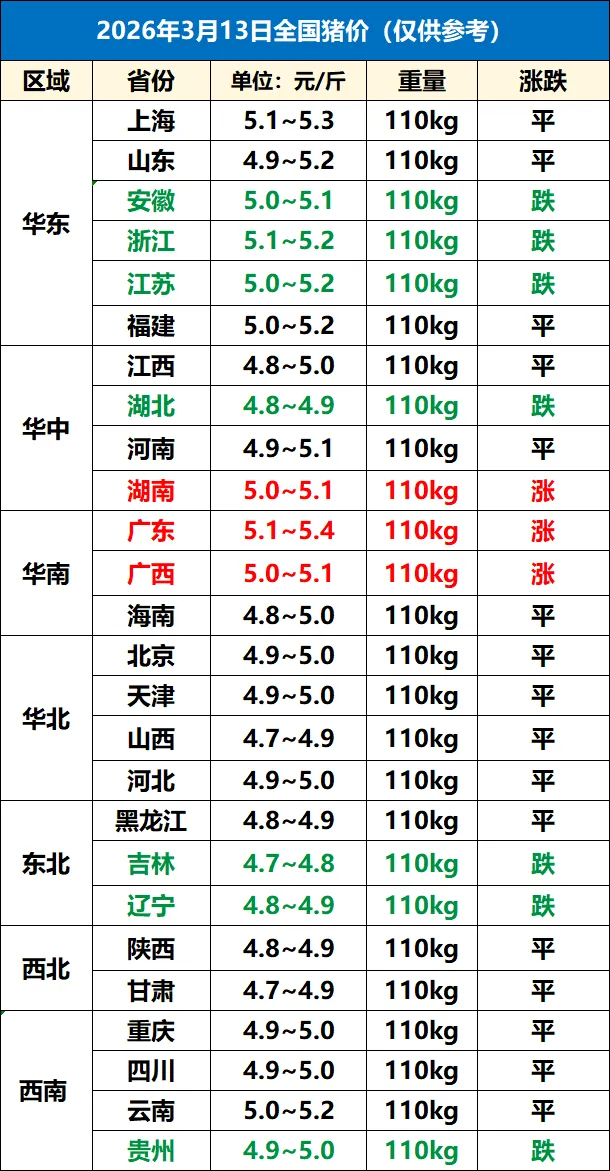 3月13日全国猪价跌猛了,“破5入4”,创新低! 养羊网 2026-03-13 3月13日全国猪价跌猛了,“破5入4”,创新低! 养羊网 2026-03-13 上一篇:2026年03月13号鸡蛋价格参考 下一篇:重磅!国家出手!猪肉收储启动,能救猪价吗? 您可能还会对下面的文章感兴趣111: 相关文章 近期价格更新!!! 【超前猪价大预测】1月9日~1月11日!全国猪价! 越来越不喜欢在网上买东西 【明日猪价】3月2日:猪价巨震!全面大暴发!价格“失控”全面冲刺!