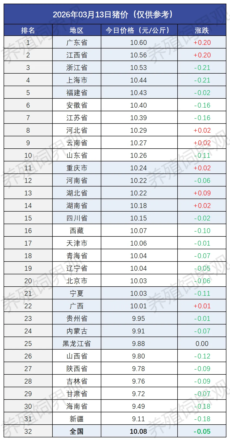 3月13日全国猪价 | 多省回涨?全国22省下跌,靠近10元大关!