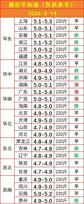 3月14日全国220斤标猪均价维持在4.7-5.4元/斤区间,整体呈现涨跌互现、区域分化的格局。