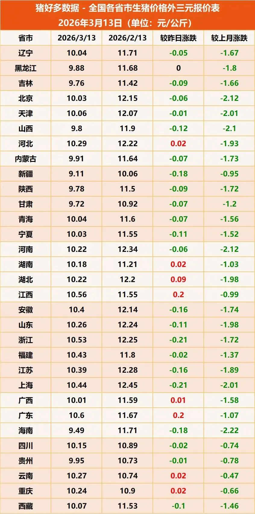 据猪好多数据监测显示,2026年3月13日全国外三元生猪均价为10.08元/公斤,较昨日下跌0.05元/公斤,当前猪价水平已经跌至近七年新低,叠加近期饲料成本节节攀上,生猪养殖亏损持续扩大,养殖端再次惊现“低价”抛售,原因是已经亏到没钱买饲料,生猪市场寒意持续升级。
