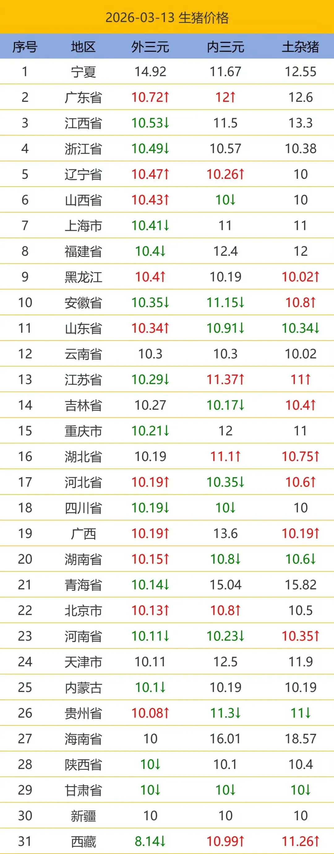 2026.03.13最新生猪价格.今日猪价,全国猪价. 养羊网 2026-03-13 2026.03.13最新生猪价格.今日猪价,全国猪价.以下猪价为平均价格(单位:元/公斤),市场时刻变动,报价不作交易依据,仅供参考。【需要更详细信息请到小程序查看】 养羊网 2026-03-13 上一篇:涨跌互现!3月猪价暗藏信号,养殖户该卖还是等? 下一篇:26年3月13日鸡蛋价格!稳! 您可能还会对下面的文章感兴趣111: 相关文章 第39篇:什么是【猪周期】? 近期价格更新!!! 烤1000个红薯,给你吃 贵州景区奔波到累瘫的碎碎念