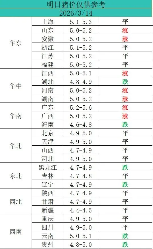 2026年3月14日全国猪价信息/供大家参考 养羊网 2026-03-13 2026年3月14日全国猪价信息/供大家参考 养羊网 2026-03-13 上一篇:猪价即将“破5入4”,有集团场4元卖猪!未来价格何时见底? 下一篇:2026.03.14-明天猪价 您可能还会对下面的文章感兴趣111: 相关文章 来帮婆婆卖家养土鸡蛋咯!!!? 生猪行业大地震!国家三连重拳出击 近期价格更新!!! 近期价格更新!!!