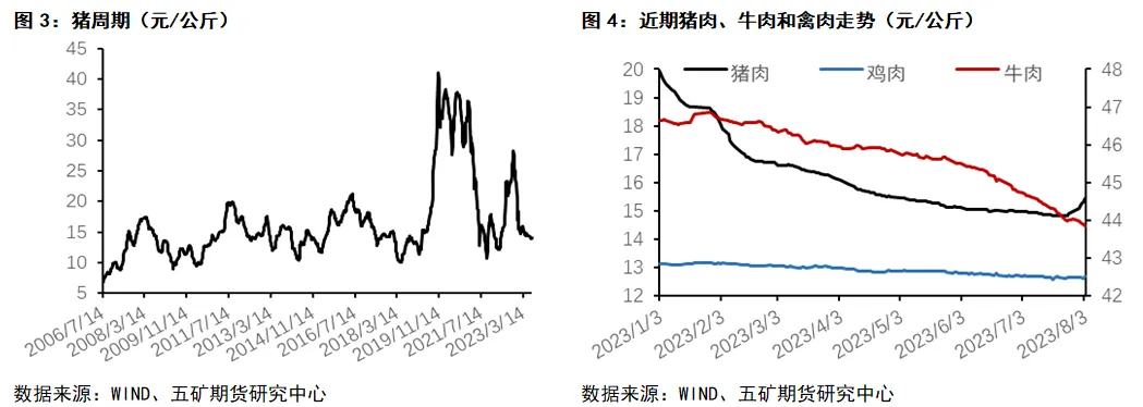 首先是今年以来猪价走势的回顾。分成两段,年初7月下旬,猪价承接了去年10月下旬以来的弱势下跌。在供应恢复、需求弱势的背景下,由年初开始,猪价持续处于普遍的成本线之下,积弱难返;不过,下方托底力量也较为坚决,价格同比未创新低,而是呈现出窄幅和抵触式的下跌走势,以时间换取空间。主流价格的波动区间在14-16元/公斤。上半年为传统的猪肉消费淡季,尽管有疫情放开以及冻品入库等需求端利好,但基础供应也处于快速的恢复期,加之前期供应积压导致的体重偏大、大猪较多,叠加投机性压栏和二育轮番出栏施压,猪价始终未能摆脱颓势,供大于求梦魇挥之不去。下方托底力量则来自于政策性收储、冻品入库以及二育抄底等投机行为的支撑。7月下旬至今,在大猪紧缺、体重压力缓解、标肥价差逆转等因素的推动下,惜售和二育入场,猪价迅速从底部反弹,目前运行在17-18元/公斤区间。猪价同比偏弱,对CPI形成明显拖累,同比数值由1月份的2.1%下降到6月份的0%。