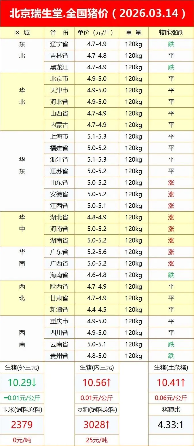 【每日猪价】北京瑞生堂猪价(2026-03-14)全国猪价