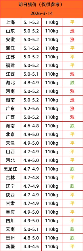 明日猪价(仅供参考) 2026/3/14 上海 5.1-5.3 110kg 平 山东 5.0-5.2 110kg 涨 安徽 5.0-5.2 110kg 涨 浙江 5.1-5.2 110kg 平 江苏 5.0-5.2 110kg 平 福建 5.0-5.2 110kg 平 江西 5.0-5.1 110kg 涨 湖北 4.8-4.9 110kg 跌 河南 5.0-5.2 110kg 涨 湖南 5.0-5.2 110kg 涨 广东 5.2-5.6 110kg 涨 广西 5.0-5.2 110kg 涨 海南 4.6-4.8 110kg 跌 北京 4.9-5.0 110kg 平 天津 4.9-5.0 110kg 平 山西 4.7-4.9 110kg 平 河北 4.9-5.0 110kg 平 黑龙江 4.7-4.9 110kg 跌 吉林 4.7-4.8 110kg 平 辽宁 4.7-4.9 110kg 跌 陕西 4.7-4.9 110kg 平 甘肃 4.7-4.9 110kg 平 重庆 4.9-5.0 110kg 平 四川 4.9-5.0 110kg 平 云南 5.0-5.1 110kg 跌 贵州 4.8-5.0 110kg 跌 新疆 4.4-4.5 110kg 平