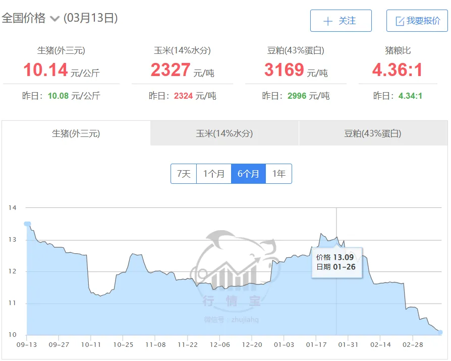 据行情宝监测数据显示,截至3月13日,全国外三元生猪均价跌至10.14元/公斤,较1月下旬高点暴跌22.5%,半数省份跌入“4元区间”,春节后跌势已持续22天且未止跌。