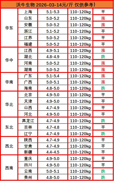 ? ?猪价播报沃小牛,助力养猪牛牛牛!各位养猪的老铁们,大家好!我是沃小牛,明天是2026年03月14日,最新猪价已经出来了:明天全国的猪价大多数省份仍处于“磨底企稳”阶段,比较积极的是出现了近期最多地区的飘红现象。虽然短时间很难出现趋势性的大幅上涨或反转,但“慢牛”景象也许可以期待,因为当下出栏数量只对应回10个月之前的能繁母猪数量,彼时已开始有产能调控的动作启动。结论就是:正在筑底,但“弱反弹”为主。 整体价格集中在 4.4-5.5元/斤 区间,且呈现南涨北跌、中间持平的分化格局。这表明市场距离真正的“政策底”和“成本底”已经非常近了,继续大幅暴跌的空间被锁死。当前定性:市场处于深度亏损下的底部震荡期。虽然个别省份在涨,但更多是因为低价区养殖户惜售导致的局部博弈,缺乏全行业普涨的动力。