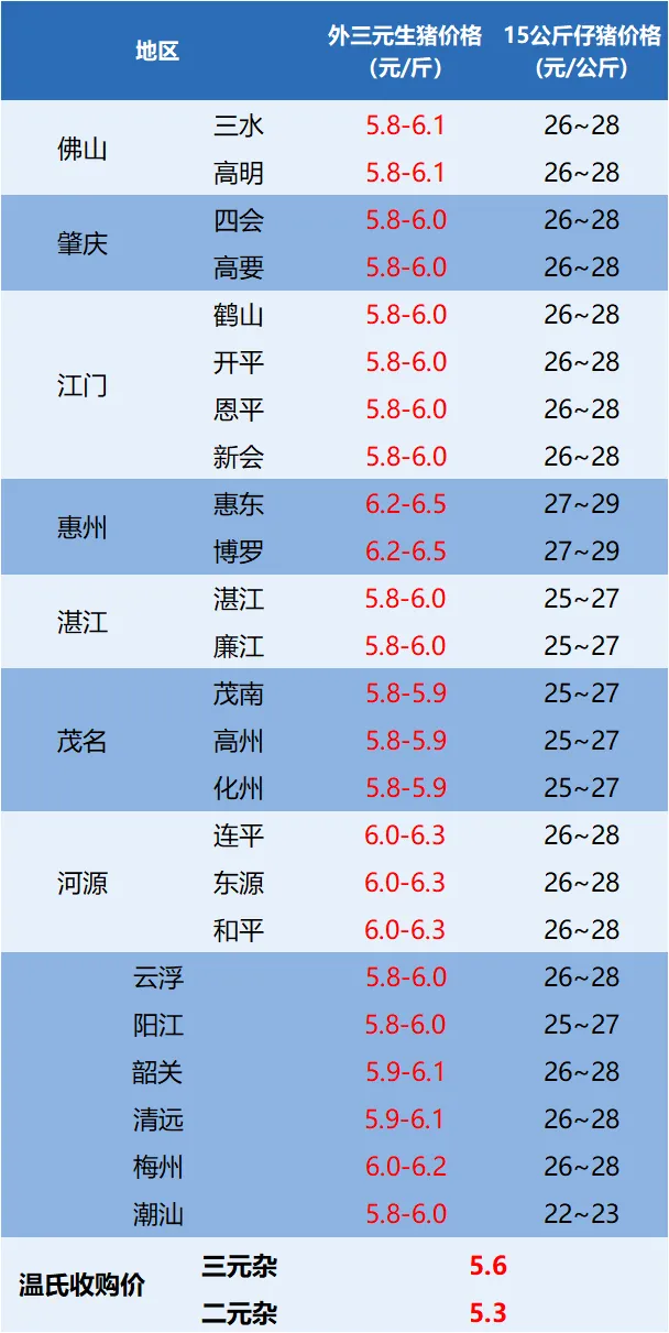 今日广东省外三元、15公斤仔猪价格