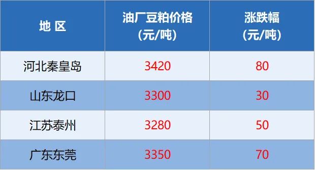 今日全国重要地区油厂豆粕(43%蛋白)价格