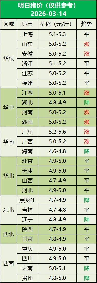 明日猪价(2026年03月14日) 养羊网 2026-03-13 明日猪价(2026年03月14日) 养羊网 2026-03-13 上一篇:3月13日猪价|小幅下跌! 下一篇:【明日猪价】2026-3-14全国生猪价格(多地小幅反弹上涨) 您可能还会对下面的文章感兴趣111: 相关文章 猪价跌至11.3元,冻肉狂抛,今年养猪人如何 【猪价】2026.02.15福建各地区每日最新猪价 工作室作品-能源与游牧——乌兰巴托游牧景观 近期价格更新!!!
