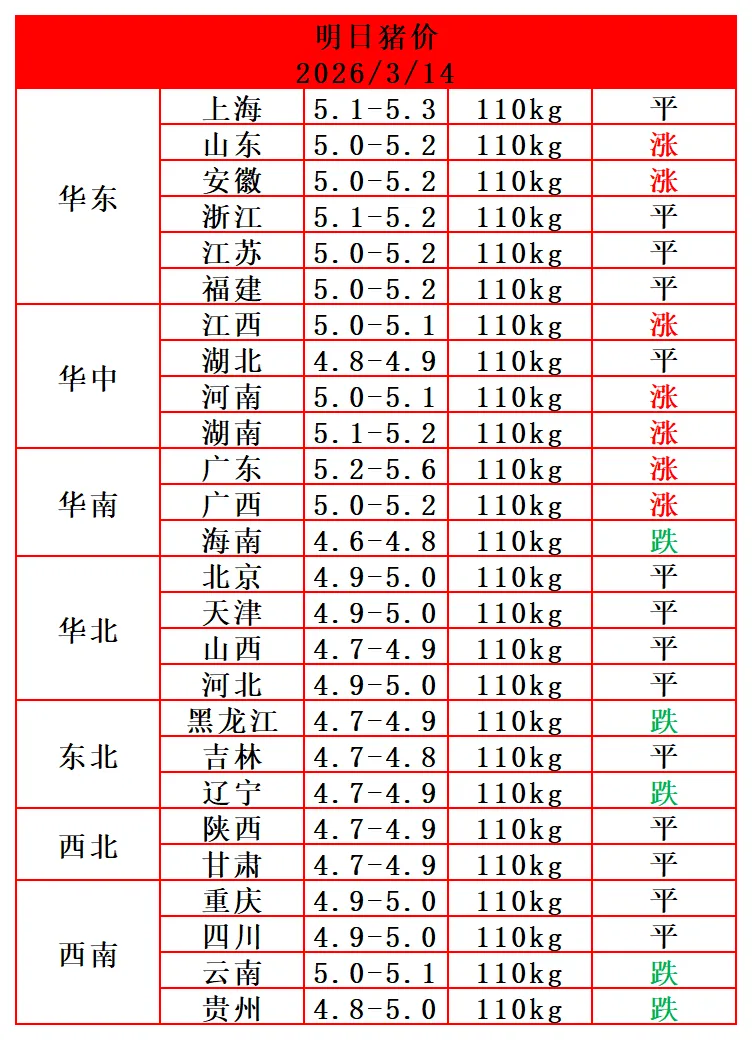 2026.3.14-明日猪价(好消息,猪价又上涨了!) 养羊网 2026-03-13 2026.3.14-明日猪价(好消息,猪价又上涨了!) 养羊网 2026-03-13 上一篇:【明天猪价】3月14日国猪价(已更新!) 下一篇:【农阳农牧】猪价创4年新低 未来价格何时见底? 您可能还会对下面的文章感兴趣111: 相关文章 今日猪价(2026.02.04) 【超前猪价大预测】3月11日~3月13日!2026猪场面临两大考验! 猪价呈现大部上涨,集团缩量市场乱像 云养羊??