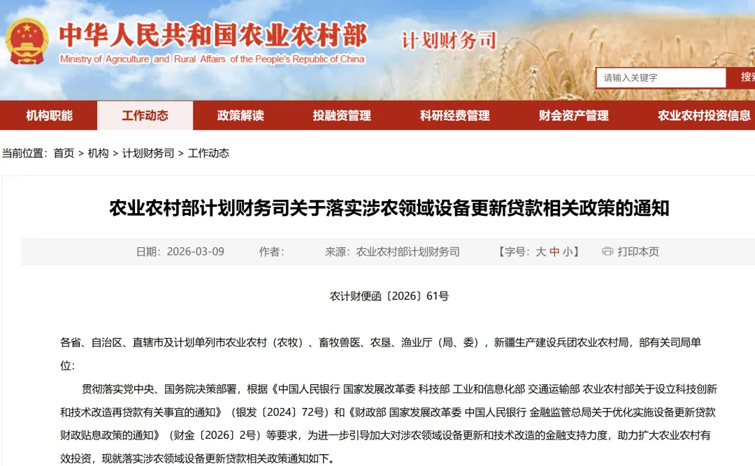 贯彻落实党中央、国务院决策部署,根据《中国人民银行 国家发展改革委 科技部 工业和信息化部 交通运输部 农业农村部关于设立科技创新和技术改造再贷款有关事宜的通知》(银发〔2024〕72号)和《财政部 国家发展改革委 中国人民银行 金融监管总局关于优化实施设备更新贷款财政贴息政策的通知》(财金〔2026〕2号)等要求,为进一步引导加大对涉农领域设备更新和技术改造的金融支持力度,助力扩大农业农村有效投资,现就落实涉农领域设备更新贷款相关政策通知如下。
