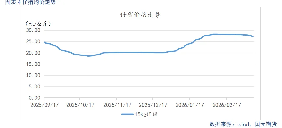 截至3月11日,仔猪出栏均价27.1元/公斤,较上周环比下跌0.82元/公斤。元宵节后,猪价持续低迷,养殖端补栏情绪偏谨慎,仔猪价格小幅走弱。