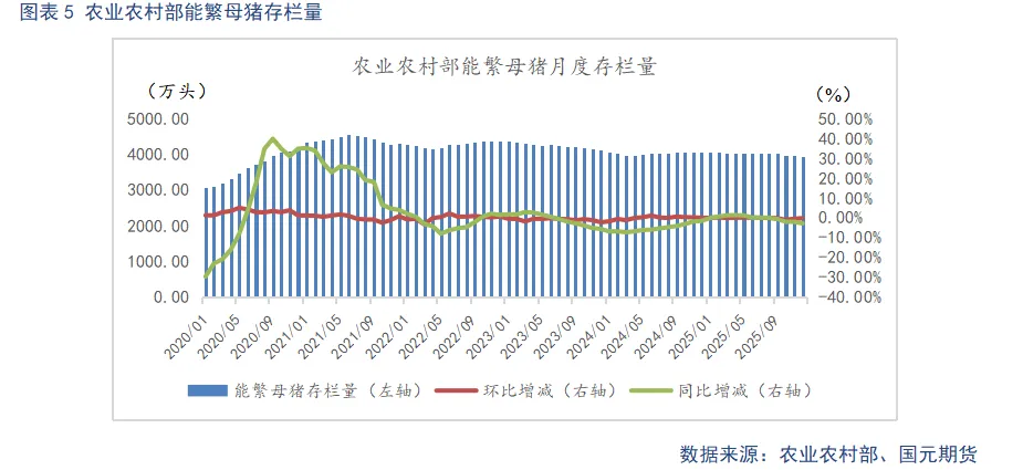 根据农业农村部数据显示,2025年四季度末全国能繁母猪存栏量为3961万头,同比下降2.9%,环比三季度末下降1.8%,为正常保有量的101.6%。全国能繁母猪存栏量自25年10月跌破4000万头整数关口,并保持逐月小幅下降趋势,显示出能繁母猪存栏已出现阶段性收缩迹象。不过由于前期基数较大,26年上半年依然处于产能兑现期,下半年供给压力有望逐步缓解。