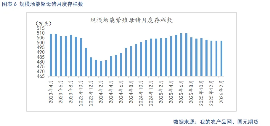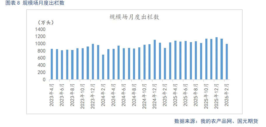 据Mysteel统计,截至2026年2月底,样本规模场能繁母猪存栏量为502.04万头,环比微降0.01%,同比下降0.48%。春节前,现货猪价相对偏强,养殖端主动去产能意愿不强。节后,市场步入低迷,部分规模场加速淘汰进度,预计3月能繁母猪存栏将小幅下降。从生产周期推算,供应实质性缓解预计在26年二季度后,后续也要持续观察产能调控的持续性。样本规模场2月商品猪存栏数为3732.05万头,环比增加1.79%,同比增加5.57%。样本规模场2月商品猪出栏量为992.23万头,环比增加12.95%,同比增加12.12%。2月正值春节假期,出栏窗口期较短,出栏量环比大幅减少。3月规模场出栏计划量增加,供给压力偏大。