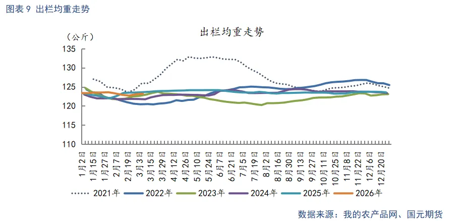 截至3月6日,生猪出栏均重123.17公斤,较上周环比上升0.11公斤。下游消费疲弱,大猪供应宽松,出栏均重小幅回升。当前出栏均重处于近三年同期偏高位,短期供应压力较大。??