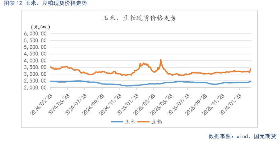 截至3月11日,玉米现货均价2439.41元/吨,较上周环比上涨25.68元/吨,豆粕现货均价3343.71元/吨,较上周环比上涨213.71元/吨。本周玉米、豆粕现货走势偏强,玉米稳步上行,豆粕涨幅明显。玉米方面,主要得益于国内基层余粮减少、下游饲料及深加工企业补库需求释放,叠加国际玉米期货震荡上涨的外部支撑,供需紧平衡支撑价格企稳回升。豆粕方面,受国际地缘政治以及巴西大豆发运滞后导致进口成本抬升,叠加国内油厂开机率偏低、库存偏紧,养殖刚需托底,多重影响因素推动下,豆粕价格走强。