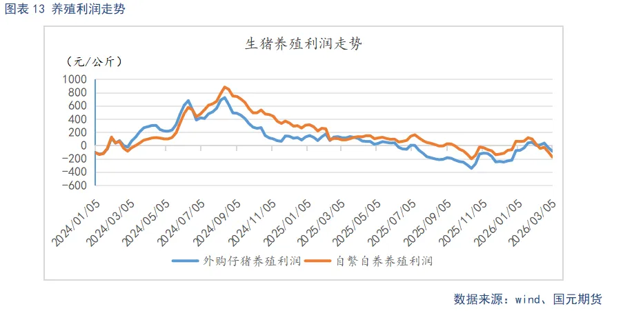 截至3月6日,自繁自养养殖亏损176.34元/头,利润较上周环比下降78.53元/头。外购仔猪养殖亏损87.42元/头,利润较上周环比下降53.42元/头。节后淡季需求低迷,供给持续释放下,猪价延续弱势。自繁自养养殖步入亏损区间,而外购仔猪养殖,由于补栏成本偏低,亏损程度相对较小。关注养殖利润变化下,行业的产能去化进度。