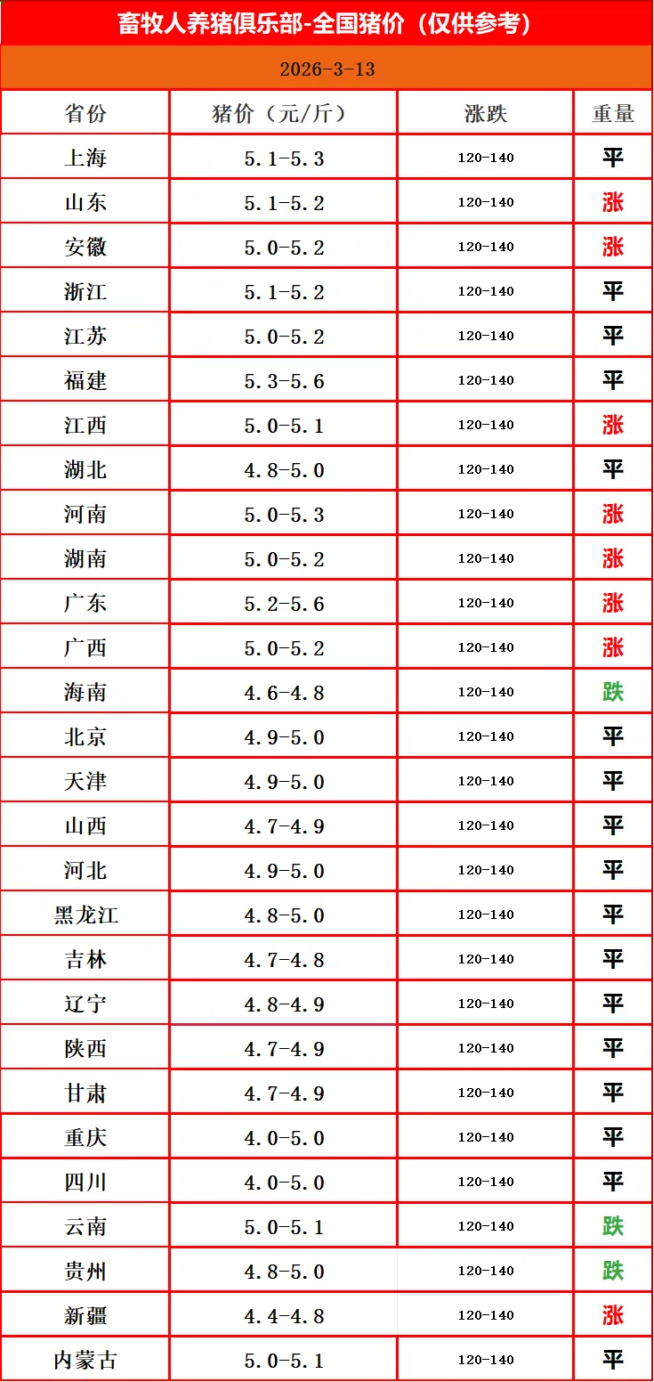 全国生猪价格稳中震荡,本周猪价进入底部磨底区间,行业以深亏模式开启被动减产降重目标,猪场应结合自身猪只大小有序出栏。截止3月13日,外三元全国均价为5元/斤。