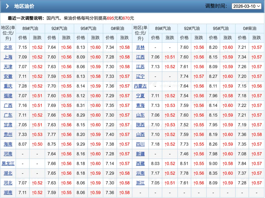 综合这些因素来看,在3月23日24:00即将实施的新一轮汽柴油价格调整当中,油价大概率还会继续大幅上涨。预计92、95号汽油、0号柴油价格涨幅将达到每吨980元,92号汽油价格也将创下自2026年开始以来的新高纪录。
