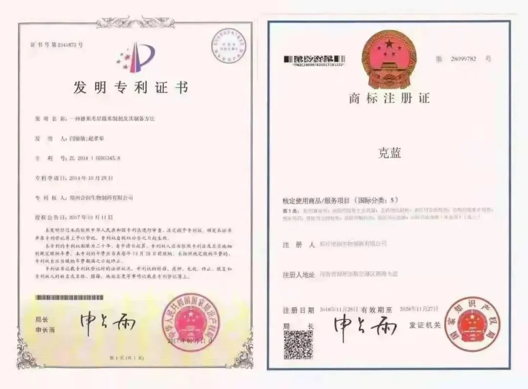 (1)研究历程:克蓝是畅销产品从08年开始就已经使用,历经十多年年逐步完善,2016年初上报农业部门经过一年的论证研究证实,证明克蓝套餐,针对蓝耳,圆环,副猪,支原体,链球菌,具有很好的净化治疗效果,最后颁发克蓝套餐专利证书让更多养殖朋友信任产品,并且名字申请了商标证书,是具有唯一行,专属优润集团专用。下图是产品专利证书,商标注册证书