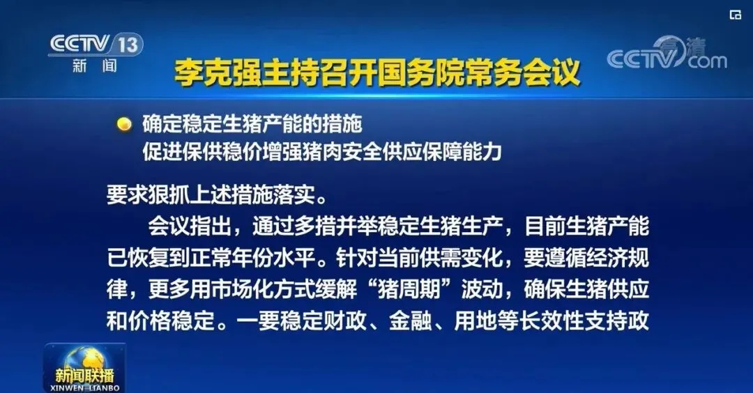会议指出,通过多措并举稳定生猪生产,目前生猪产能已从一度出现的严重滑坡较快恢复到正常年份水平。针对当前供需变化,要遵循经济规律,更多用市场化方式缓解“猪周期”波动,确保生猪供应和价格稳定。