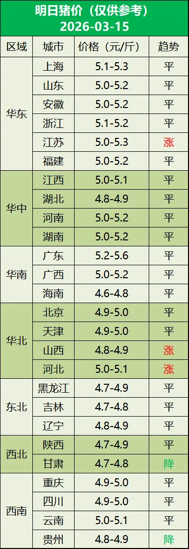 明日猪价(2026年03月15日) 养羊网 2026-03-14 明日猪价(2026年03月15日) 养羊网 2026-03-14 上一篇:明日猪价-2026年3月15日 下一篇:猪价稳字当头,局地涨跌调整!明日预计行情:3涨22平2跌!附3月15日最新全国生 您可能还会对下面的文章感兴趣111: 相关文章 02月19日猪价:局部飘红,市场悄悄变天 老爸养羊丨刘玉龙 近期价格更新!!! 2025年4月13日全国各地生猪价格信息
