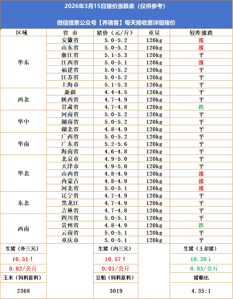 养猪客|2026.3.15|明天猪价分析(只供参考) 养羊网 2026-03-14 养猪客|2026.3.15|明天猪价分析(只供参考) 养羊网 2026-03-14 上一篇:【明天猪价】2026.3.15全国猪价!只供参考 下一篇:3月15日,猪价信息 您可能还会对下面的文章感兴趣111: 相关文章 桃源?养殖场布局 2025年4月13日全国各地生猪价格信息 农村土猪老腊肉照旧,还是三十多一斤 2025年4月13日全国各地生猪价格信息