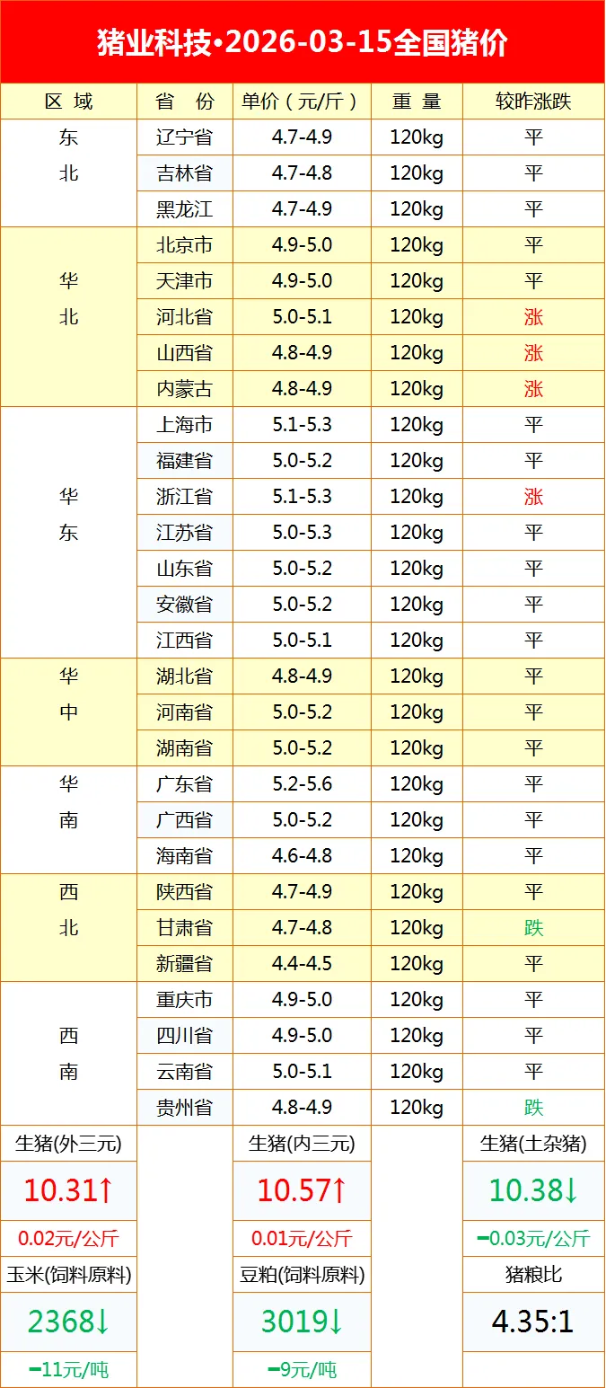 2026-03-15明日猪价 养羊网 2026-03-14 2026-03-15明日猪价? ?别忘了点个在看哦? 养羊网 2026-03-14 上一篇:涨了,猪价上涨“拐点”来了! 下一篇:今日猪价| 2026.3.15 | 明日最新猪价(仅供参考) 您可能还会对下面的文章感兴趣111: 相关文章 9月27日全国早间猪价低位震荡! 《2-5的分与合》教案 蛋易购上海鸡蛋报价2026年2月23日 近期价格更新!!!