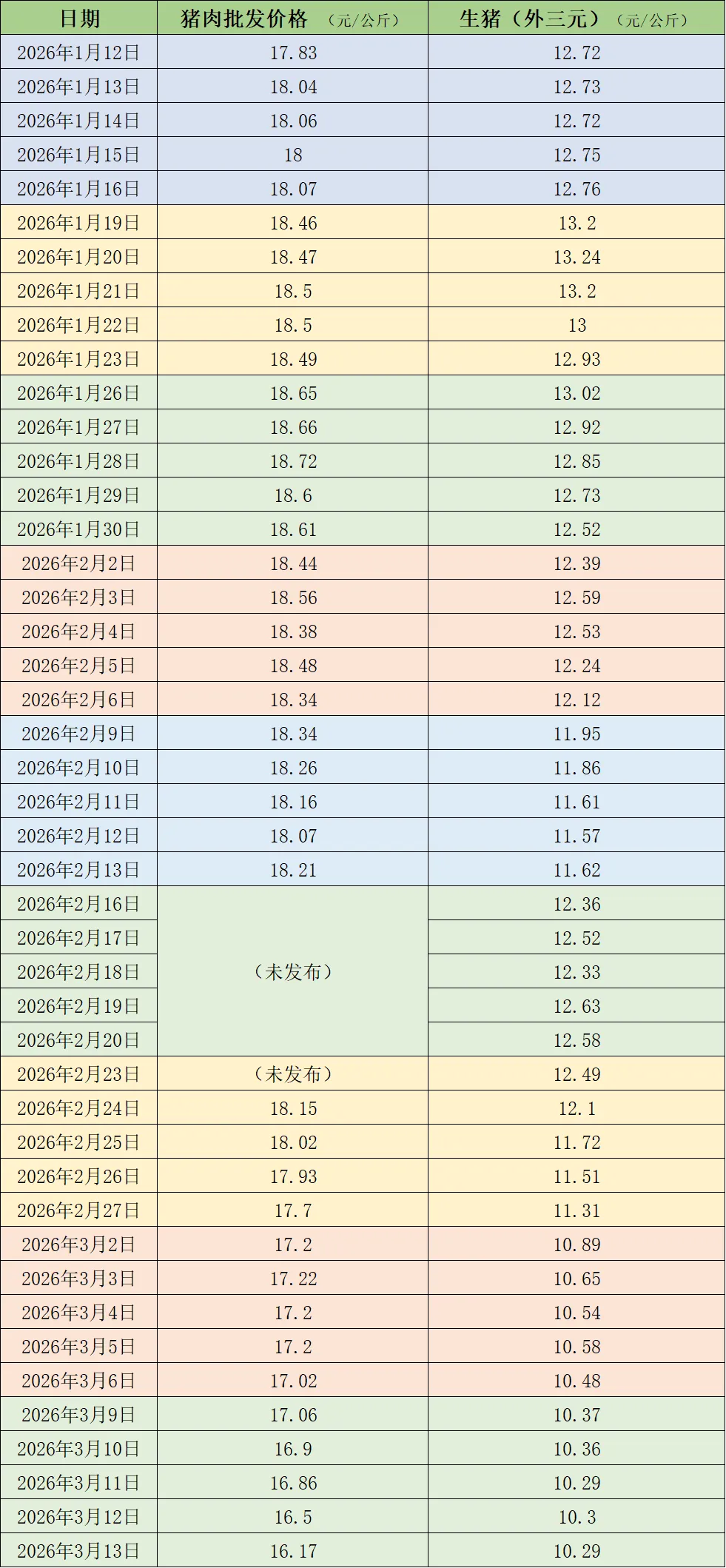 来自中国养猪网的数据显示,3月13日,生猪(外三元)的出栏均价已滑落至10.29元/公斤,部分地区低价猪源甚至已经跌破10元大关。这意味着,在养殖户的猪圈里,一头标准重量的猪,活称的价格每斤也就5块钱出头。