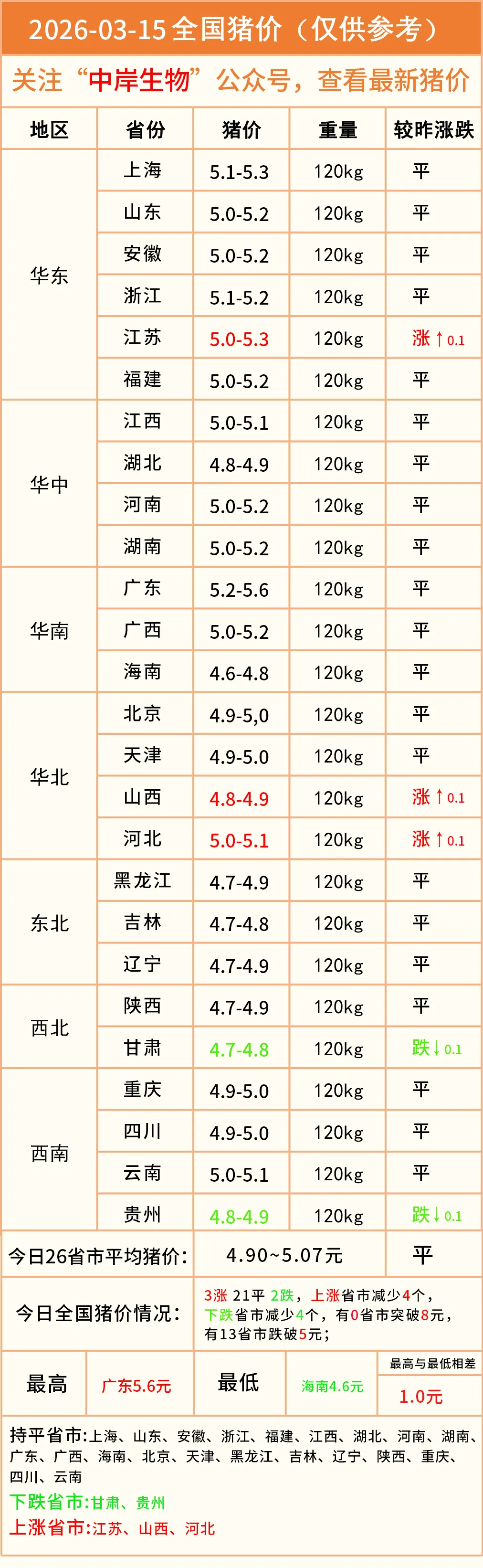 明日猪价|2026-03-15全国最新猪价(猪价已更新!) 养羊网 2026-03-14 明日猪价|2026-03-15全国最新猪价(猪价已更新!)营销中心丨0731-83806009技术服务丨0731-83806019 养羊网 2026-03-14 上一篇:2026.3.15 --鸡蛋价格 下一篇:2026年3月14日鸡蛋、淘汰鸡价格行情 您可能还会对下面的文章感兴趣111: 相关文章 近期价格更新!!! 手搓咩咩棚~ 种植致富项目:全村种天麻 每户年增一万多 2025年4月13日全国各地生猪价格信息