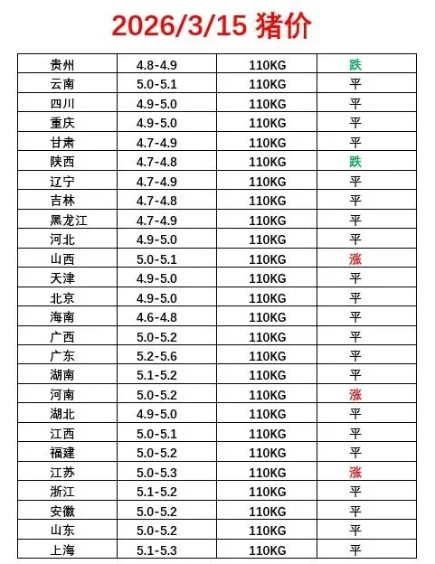 2026.3.15猪价出来了 养羊网 2026-03-15 2026.3.15猪价出来了? 关注下.每天准时报价 养羊网 2026-03-15 上一篇:3月15日猪价来了! 下一篇:3月15日猪价|速看!(仅供参考,关注转发!) 您可能还会对下面的文章感兴趣111: 相关文章 2025年1月猪价总结及2月猪价预测 要想致富 就得养兔 2025年4月13日全国各地生猪价格信息 天天收到就拍一张