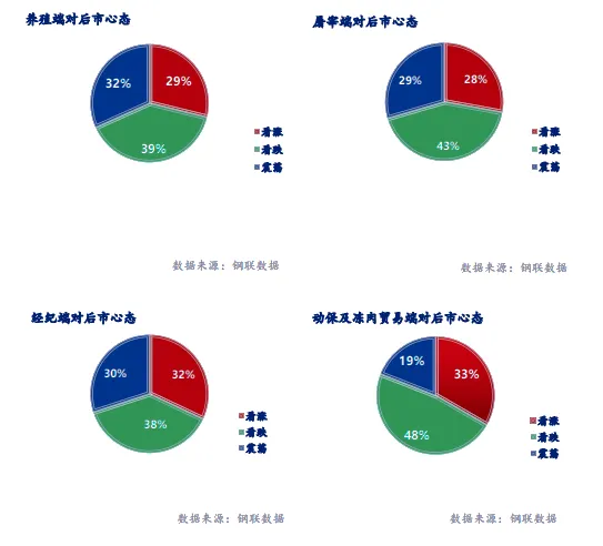 统计有24%-33%的看涨心态,38%-48%的看跌心态,19%-33%的震荡心态;其中最大看涨心态33%来源于动保及冻肉贸易端客户,最大震荡心态33%来源于金融投资类客户,最大看跌心态48%来源于动保及冻肉贸易端客户。
