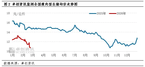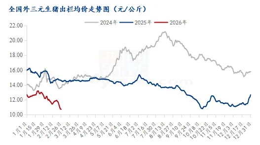 进入2月以来,生猪价格呈现加速下跌态势。卓创资讯数据显示,2月全国瘦肉型生猪均价为11.68元/公斤,月内价格呈现加速走低态势,2月25日全国瘦肉型生猪均价更是跌至10.74元/公斤,创下阶段性新低。与此同时,全国外三元生猪均价也同步走低,截至2月27日已跌至10.80元/公斤,同比跌幅高达25.57%,部分地区价格甚至下探至10元/公斤关口。