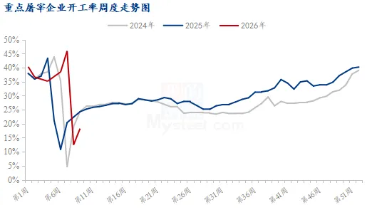 从需求端看,节后市场进入传统消费淡季,终端需求疲软态势明显。春节期间居民家庭储备了充足的猪肉库存,节后短期内采购需求大幅下降,而餐饮、学校、企业等团体消费恢复缓慢,难以形成有效支撑。数据显示,截至2月26日,当周屠宰企业开工率仅为18.27%,虽较春节假期有所回升,但仍处于年内相对较低水平,市场整体白条走货困难,屠宰企业压价意愿强烈。