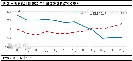 对于养殖户最关心的“何时能赚钱”的问题,卓创资讯预判,2026年上半年行业仍将以消化过剩产能、深度磨底为主,亏损状态或将持续;下半年随着产能去化效果显现及需求回暖,行业盈利将逐步修复,预计生猪自繁自养盈利将在8-9月份实现转正。