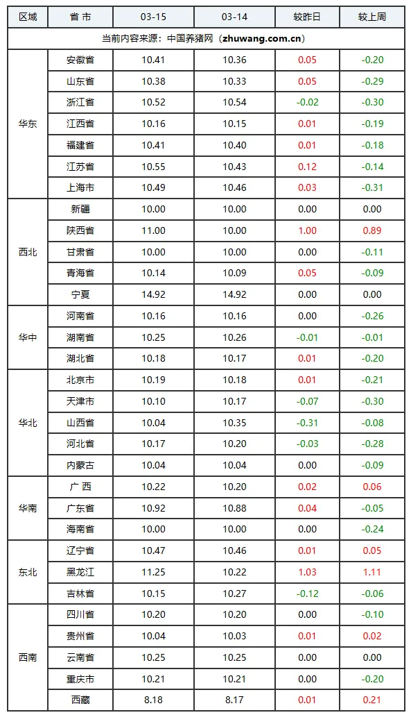 猪价上涨地区(16个):安徽省、福建省、山东省、湖北省、辽宁省、黑龙江省、贵州省、江西省、青海省、陕西省、江苏省、上海市、北京市、广西壮族自治区、广东省、西藏自治区;上涨区间:0.01-1.03元/公斤; 猪价持平地区(9个):新疆维吾尔自治区、甘肃省、宁夏回族自治区、河南省、内蒙古自治区、海南省、四川省、重庆市、云南省; 猪价下跌地区(6个):浙江省、天津市、山西省、湖南省、河北省、吉林省;下跌区间:0.01-0.31元/公斤; 2026年03月16日-中国养猪网 玄田算法预测明日猪价