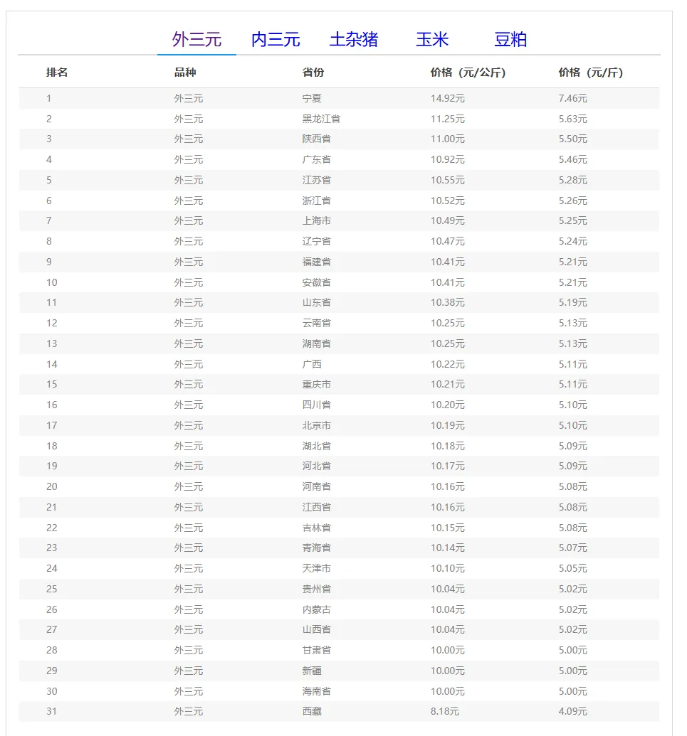 外三元排行前三:宁夏回族自治区14.92元/公斤、黑龙江省11.25元/公斤、陕西省11.00元/公斤;