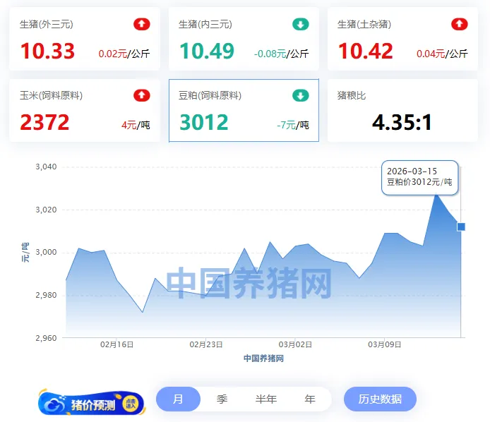 2026年03月15日-中国养猪网 全国豆粕价格走势图及涨跌表