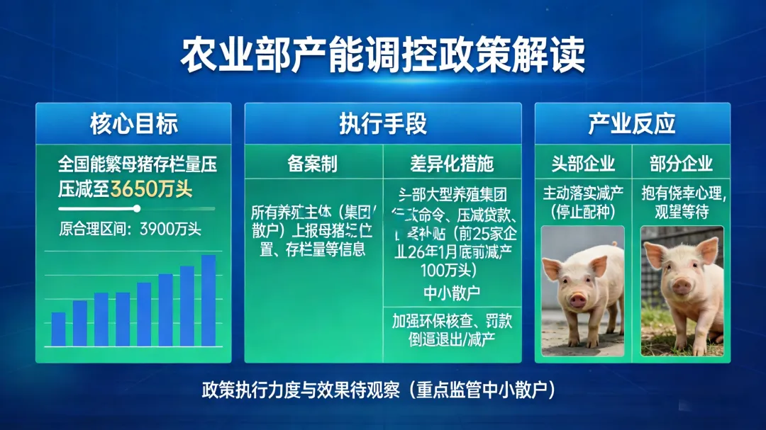 差异化措施:对于头部大型养殖集团,主要通过行政命令、压减贷款、收紧补贴等方式督促减产(例如,此前已要求前25家企业带头在26年1月底前减产100万头)。对于中小散户,可能通过加强环保核查、罚款等方式倒逼其退出或减产。