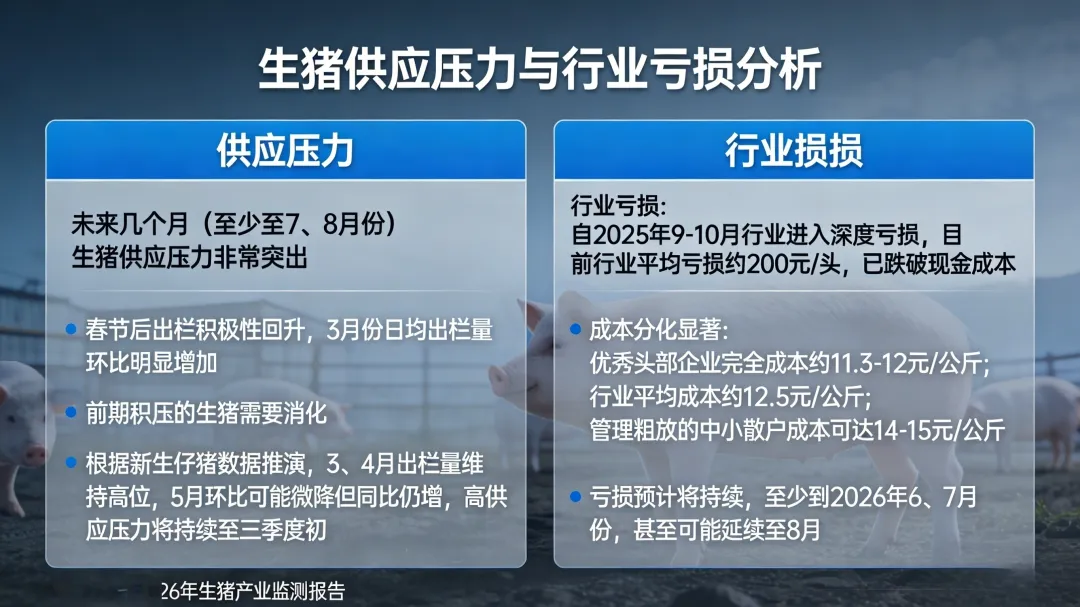 行业亏损:自2025年9-10月行业进入深度亏损,目前行业平均亏损约200元/头,已跌破现金成本。 成本分化显著:优秀头部企业完全成本约11.3-12元/公斤;行业平均成本约12.5元/公斤;管理粗放的中小散户成本可达14-15元/公斤。 亏损预计将持续,至少到2026年6、7月份,甚至可能延续至8月。