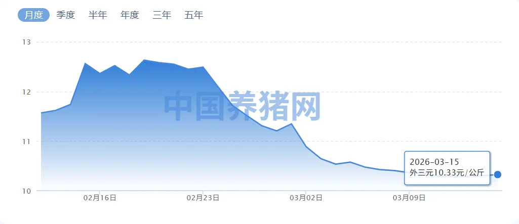 3月已过半,然而生猪市场颓势尽显。国内标猪出栏均价已失守10元/公斤关口,这一价格水平创下近五年来的最低纪录。与年初的高点相比,此轮下跌幅度已超过24%。受此影响,行业盈利空间被严重挤压,目前自繁自养模式已普遍陷入亏损状态。