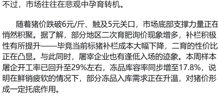 ? ? ? 整体来看,当前猪价已跌至阶段性低位,继续下探空间有限。随着二育和屠企抄底意愿增强,市场情绪或逐步企稳。但对于养殖户而言,行业供需格局尚未根本扭转,短期反弹力度仍需观察,理性出栏、控制成本仍是当下应对外部波动的关键。