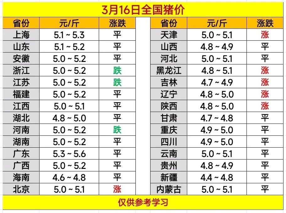 2026.3.16——明日猪价预测 养羊网 2026-03-15 2026.3.16——明日猪价预测 养羊网 2026-03-15 上一篇:猪价行情微涨,北强南稳!明日预计行情:6涨18平3跌!附3月16日最新全国生he 下一篇:猪价跌破5元,养猪人泪流满面!专家:黎明前黑暗,下半年必迎转机 您可能还会对下面的文章感兴趣111: 相关文章 美国鸡蛋价格飙升,多种农产品价格同步上涨 【一箱蛋】2.25-全国鸡蛋价格与供求信息!(震荡盘整 ,走货一般!) 2025年4月13日全国各地生猪价格信息 DAY13