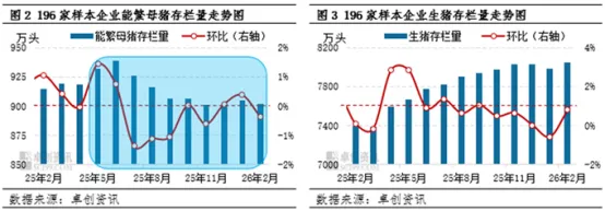 猪价持续下行的根本原因是市场供应过剩,叠加需求季节性疲软。供应端,能繁母猪和生猪存栏量持续高位:2025年能繁母猪存栏呈“先增后减再盘整”态势,2026年2月份样本企业能繁母猪存栏较2025年6月高点仅下滑3.95%,未达去产能目标。2025年末全国能繁母猪存栏3961万头,仍高于3900万头正常保有量;同时行业生产效率提升,主流猪场PSY普遍提升1-2头,部分达27-28头,对冲了母猪减少的影响,2026年生猪预计出栏72100万头,同比微增0.18%。需求端,3-8月份为传统消费淡季,终端需求寡淡,猪价变动主要受供应端主导,9月份后需求才会逐步好转。