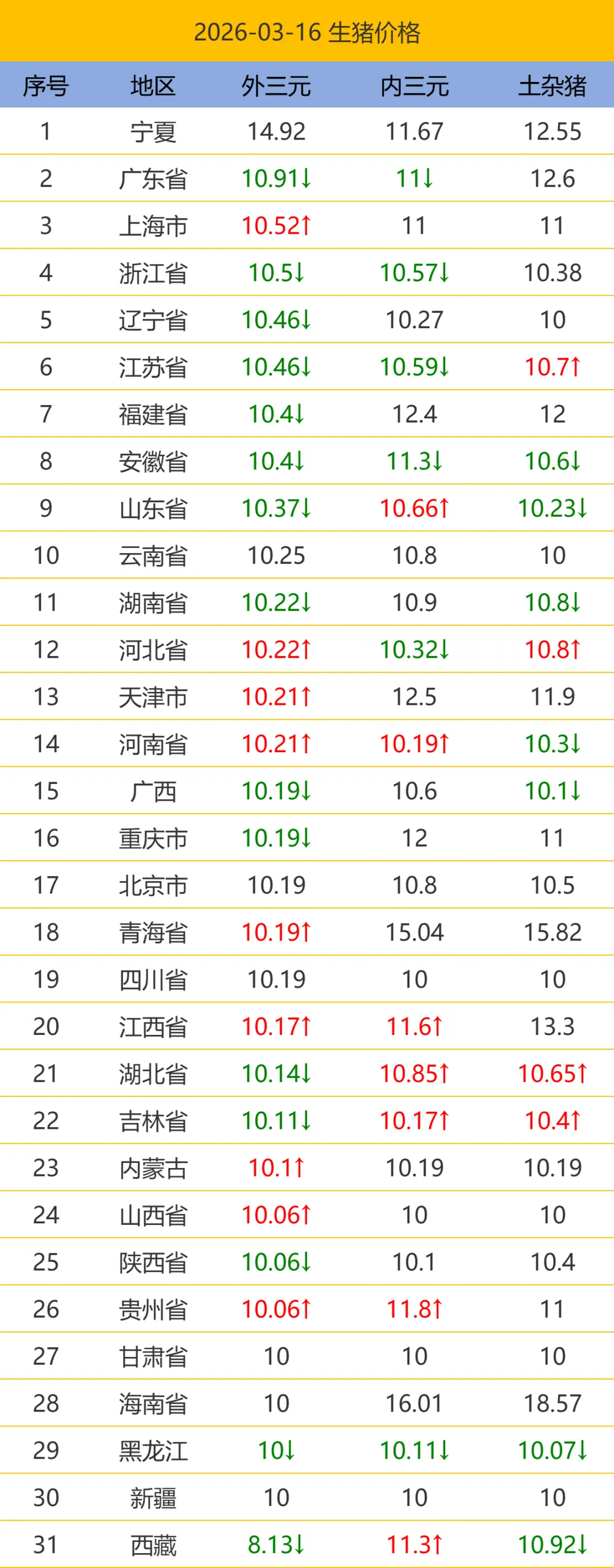 2026.03.16最新生猪价格.今日猪价,全国猪价. 养羊网 2026-03-16 2026.03.16最新生猪价格.今日猪价,全国猪价.以下猪价为平均价格(单位:元/公斤),市场时刻变动,报价不作交易依据,仅供参考。【需要更详细信息请到小程序查看】 养羊网 2026-03-16 上一篇:3月16日鸡蛋价格稳中有涨 下一篇:湖北迪仕铭2026年03月15日鸡蛋行情价格 您可能还会对下面的文章感兴趣111: 相关文章 今日各地鸡蛋价格 2026年1月18日今日鸡蛋价格早报--持续更新中…… 2025年4月13日全国各地生猪价格信息 猪价大稳小涨!明日预计行情:8涨16平3跌!附1月13日最新全国生